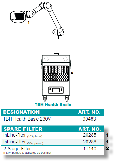 Odsávací systém TBH Health Basic 90483 v sobě kombinuje kompaktnost a účinnost v základním modelu řady Health. Je vybaven kartáčovým/uhlíkovým motorem o výkonu 0,7 kW. Vhodný je zejména pro příležitostné použití v ordinacích lékařů. Patentovaný předfiltr InLine a dvoustupňový hlavní filtr (kombinace HEPA H13 a aktivní uhlíkový filtr) spolehlivě odstraňují viry, bakterie a částečky kůže.